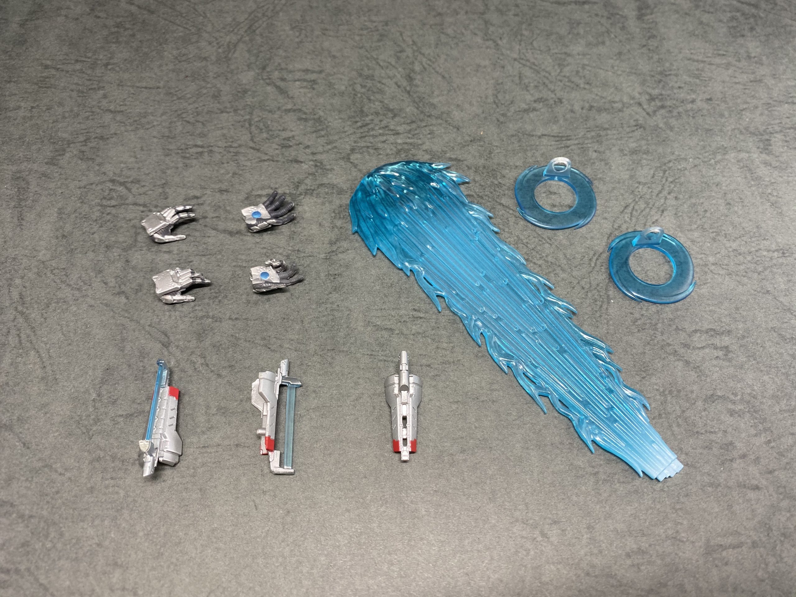 付属品は手首パーツが左右2種ずつと、二の腕の交換パーツ、エフェクトパーツです。二の腕の交換パーツはストリウムブレード展開の再現用とストリウム光線エフェクト接続用です。