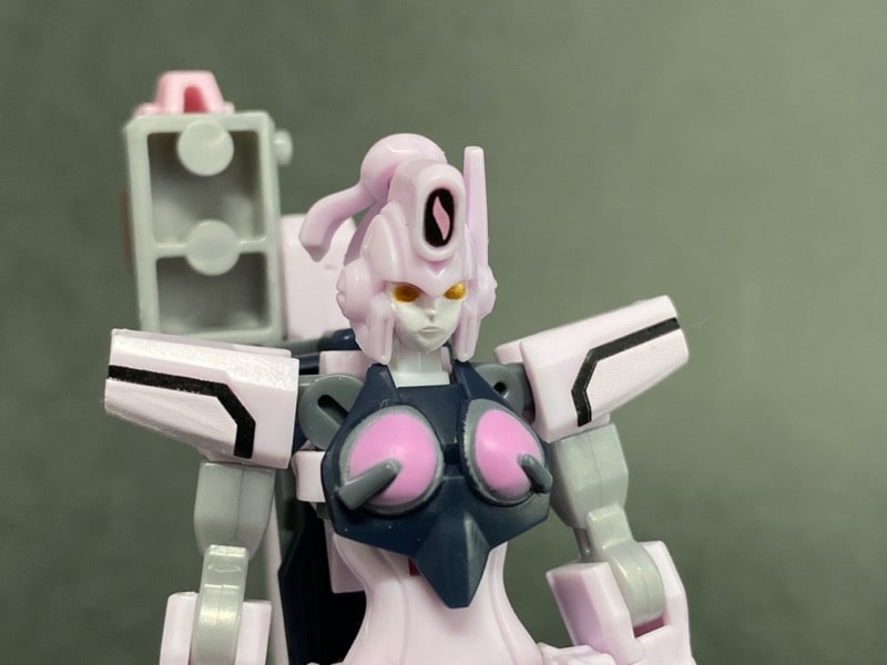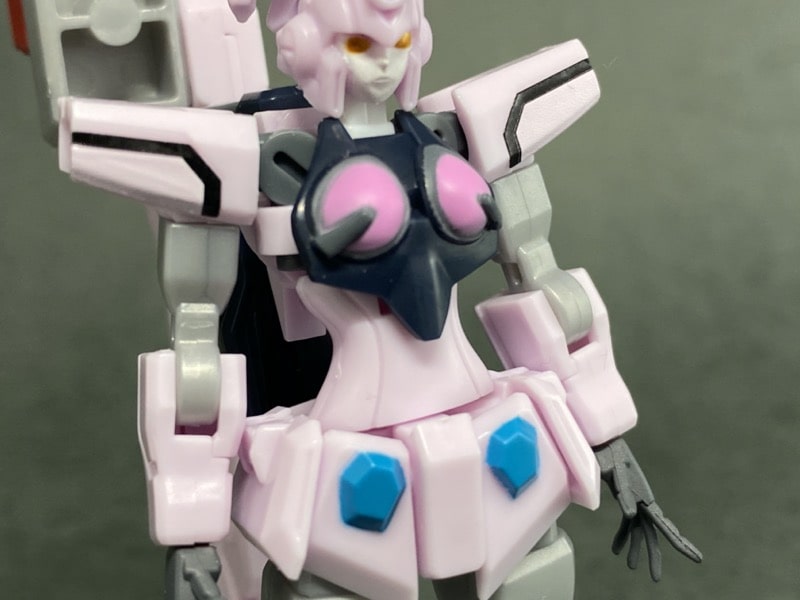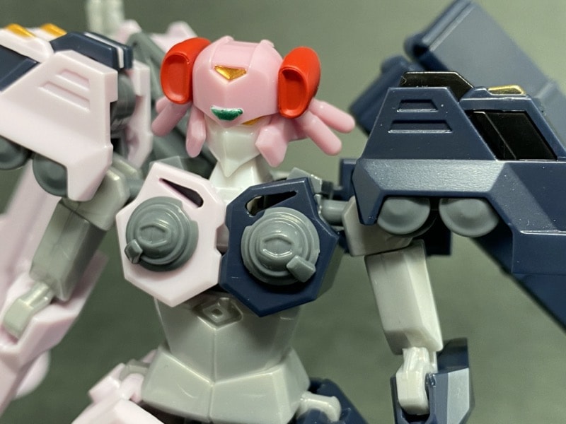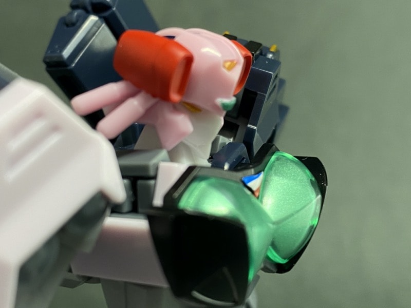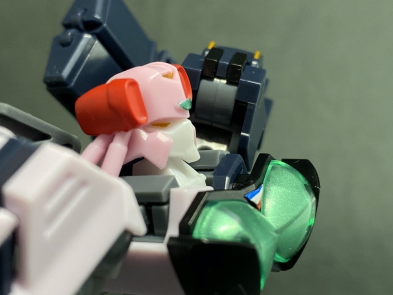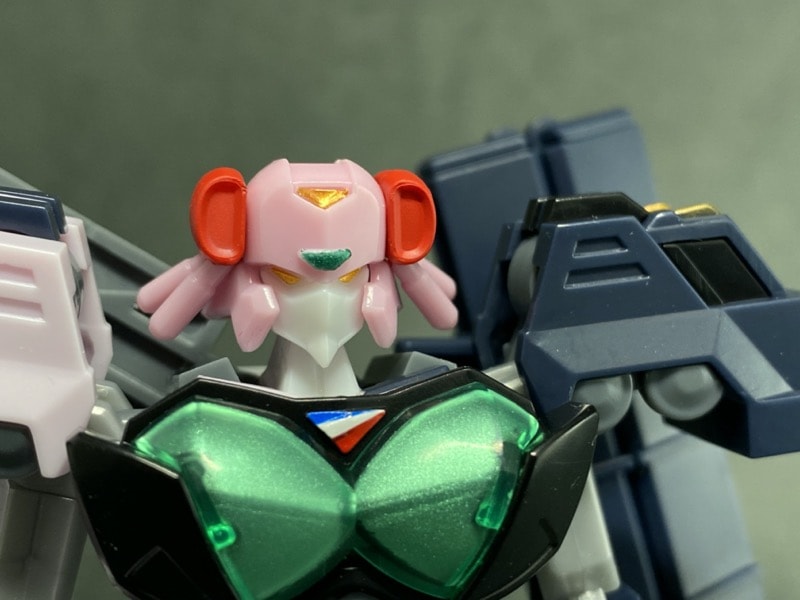頭部のアップです。瞳、額のGストーン、赤い箇所は塗装、上の金部分はシールです。