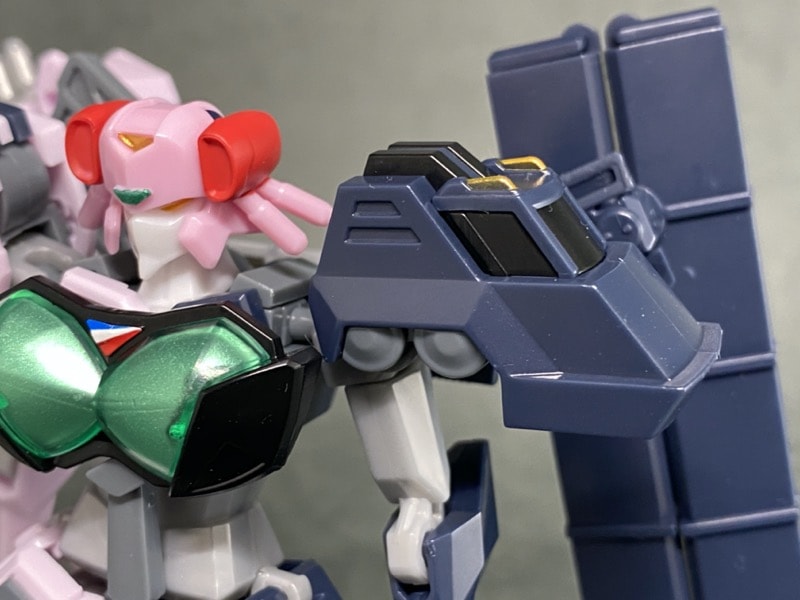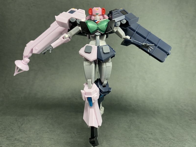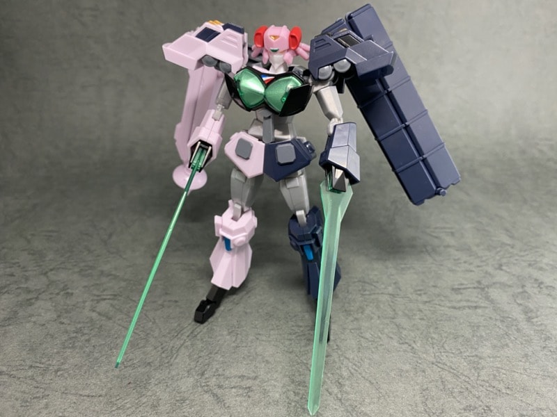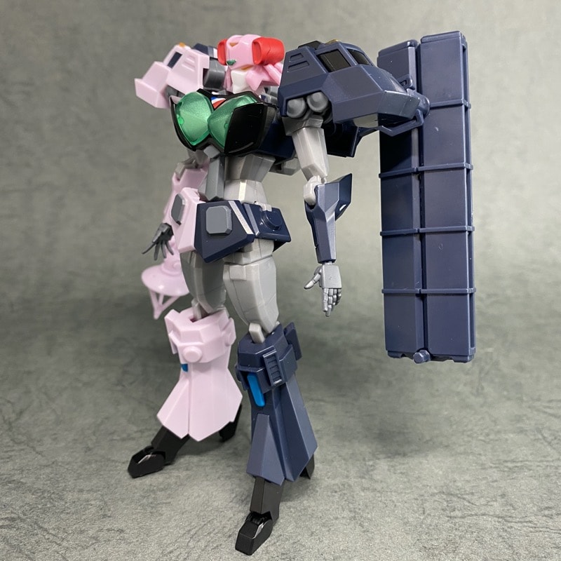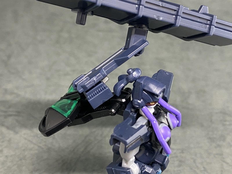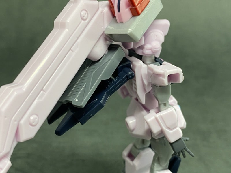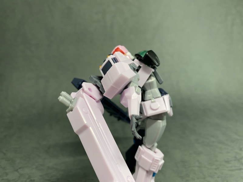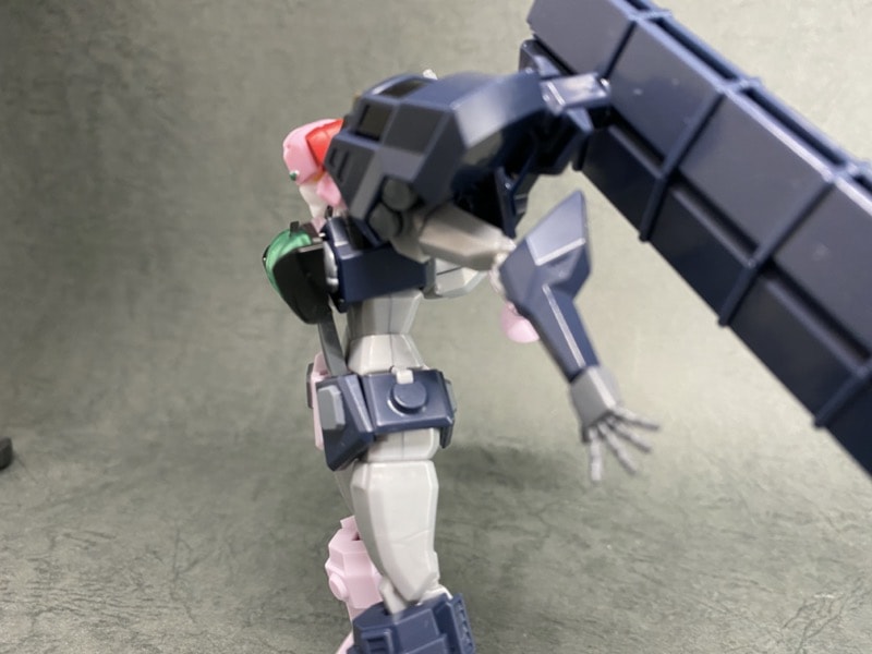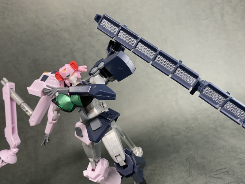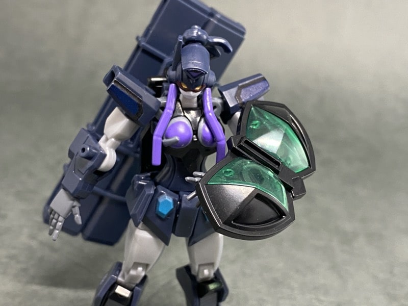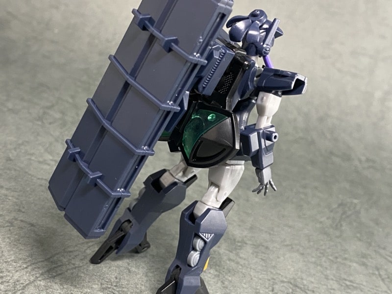 背中にマウントしているシールドを取り外して腕のジョイントに取り付けることも出来ます。シールドの緑の部分はクリアパーツ。