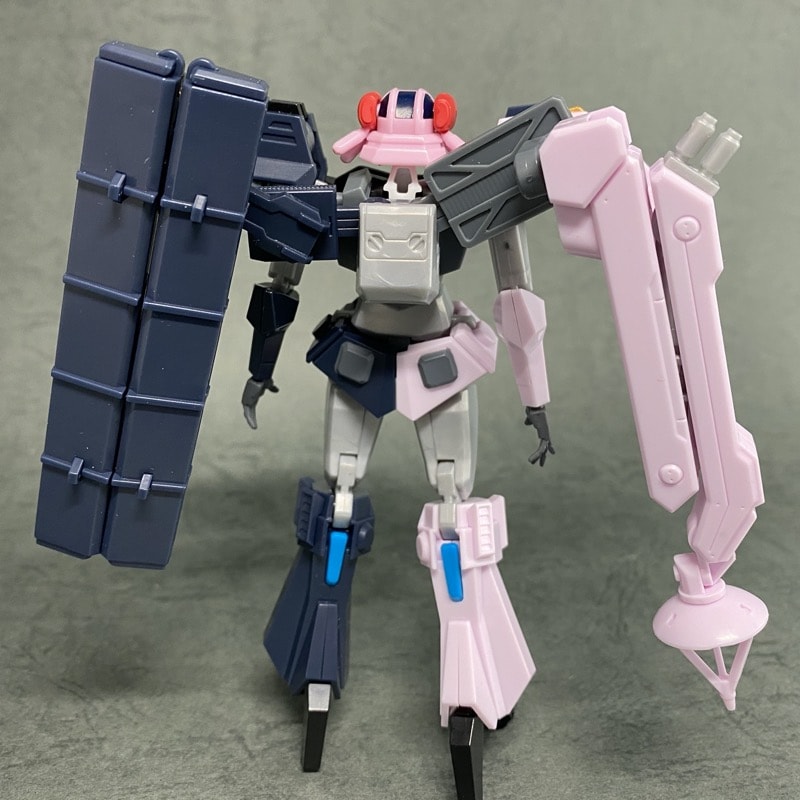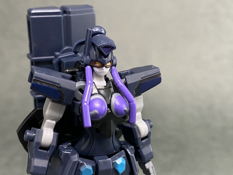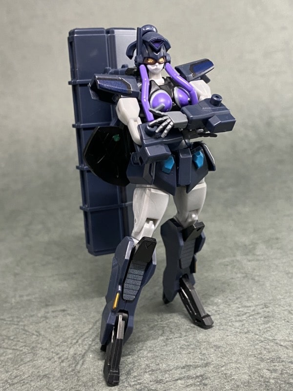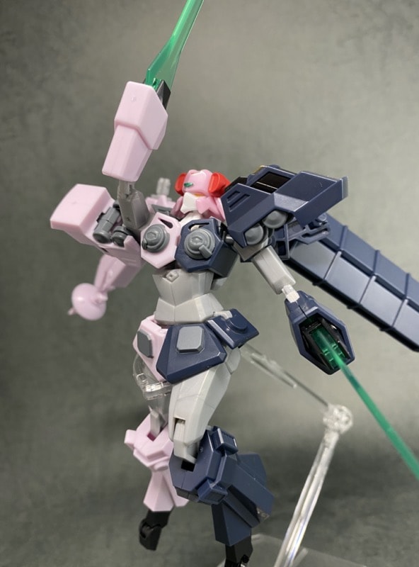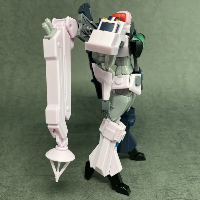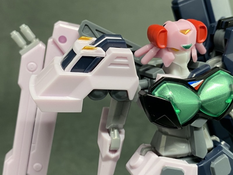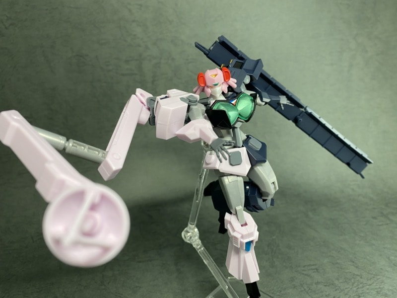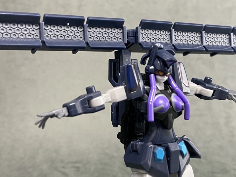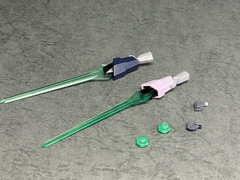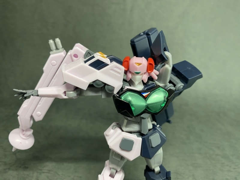 背中にマウントしているシールドを取り外して腕のジョイントに取り付けることも出来ます。シールドの緑の部分はクリアパーツ。