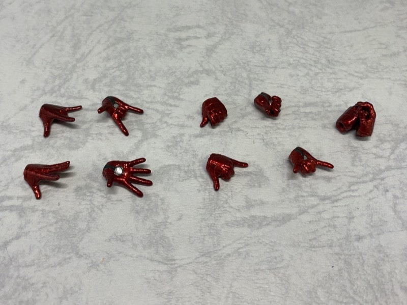 まずは交換用手首から付属品紹介です。開き手、スパイダーウェブ発射、ウェブ掴み、親指と小指を立てた手の左右各4種に加え、両手でウェブを持つ手首が付属しています。