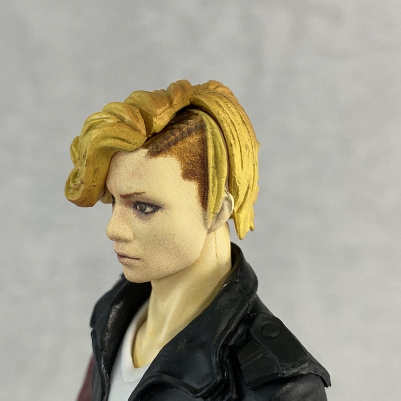 アシンメトリーな髪型はパーツ分割で再現。墨入れやグラデーション塗装で立体的になっています。