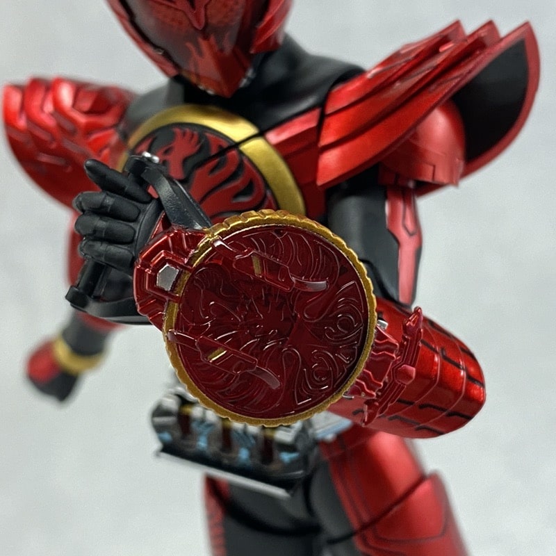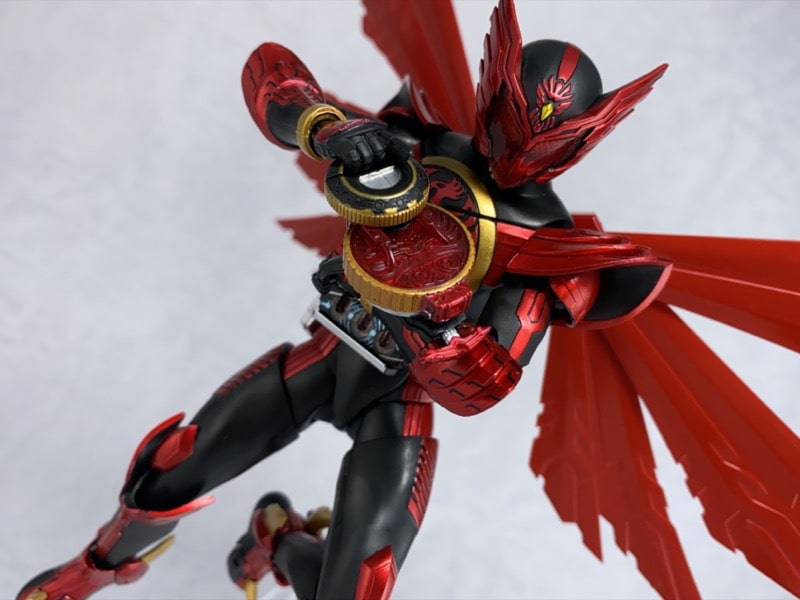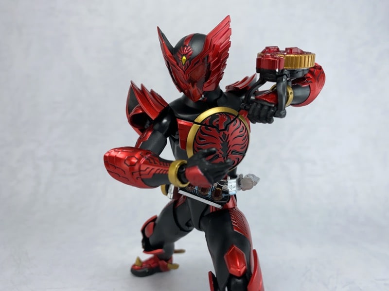 各パーツのバランスも劇中通り、全身のメタリック塗装も綺麗で、見た目の再現度については文句無しです。可動範囲も過去のオーズシリーズ同様広範囲に可動しますし、タジャスピナーが可動の妨げにならない様な構造になっているなど、新規追加部分にも工夫がされていました。付属品のボリュームもかなり多く、どこを取っても文句のない完成度でした。