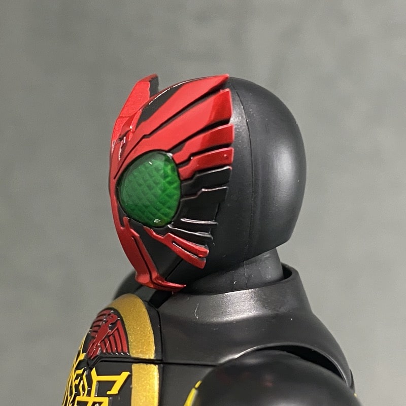 頭部のタカヘッドはメタリックレッドでタカの意匠が塗装されています。複眼はグリーンのクリアパーツで綺麗に再現。
