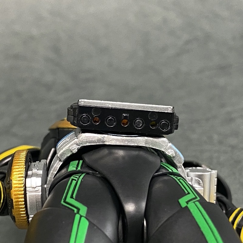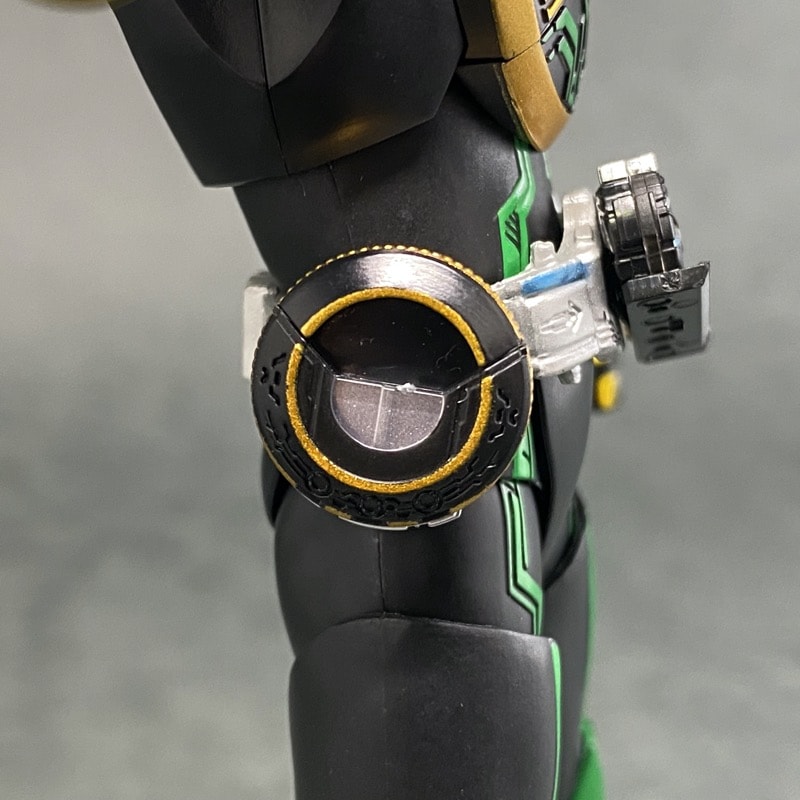 こちらはベルトから取り外したオースキャナーです。中心部分はシルバーの塗装とクリアパーツで再現。