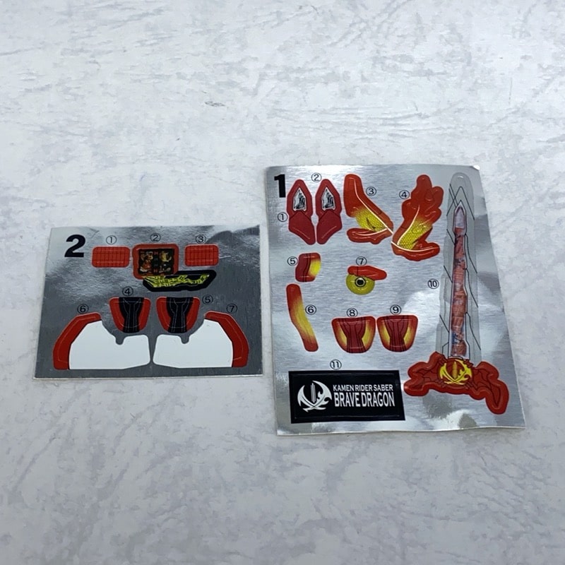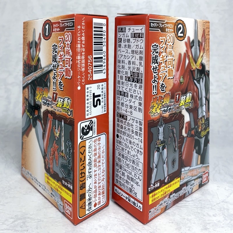 ①仮面ライダーセイバー ブレイブドラゴン Aセットには赤いドラゴン周りのパーツ、頭部、武器、スタンドなどの細かいパーツが付属しており、②仮面ライダーセイバー ブレイブドラゴン Bセットには左半身含めた胴体が付属しています。